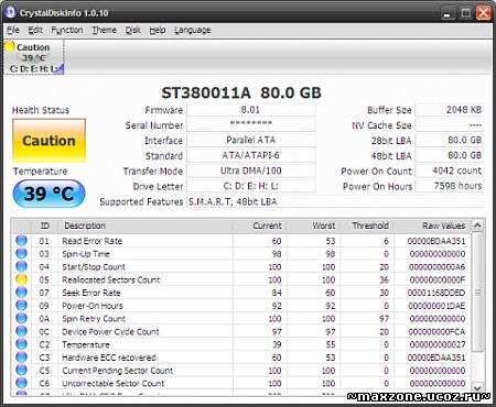 Отслеживает состояние жестких дисков, поддерживающих технологию S.M.A.R.T. Производит мониторинг и дает общую оценку "здоровья" вашего диска. CrystalDiskInfo отображает детальную информацию о жестких дисках, установленных в компьютере (прошивка, серийный номер, стандарт, интерфейс, общее время работы и др.), а также выводит параметры атрибутов системы самодиагностики S.M.A.R.T. (о