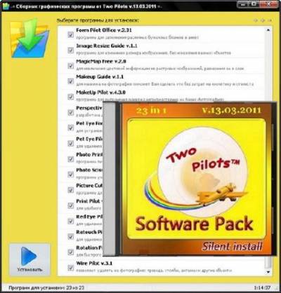 В этом сборнике 21 программа от известной и уважаемой, в мире графики, студии Two Pilots. Все программы собраны в одну оболочку, имеют тихую инсталляцию и демонстрационные примеры. Многие из них имеют русскоязычную справку. Список программ: Beauty Guide v.1.2.2 программа, с помощью которой можно нанести макияж и устранить косметические дефек